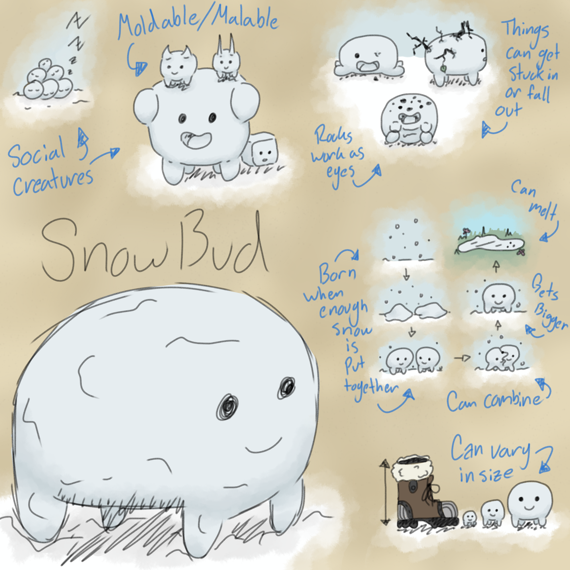 For the environments I took inspiration from games such as Hollow Knight and Kirby and the Forgotten Land. The music is from Splatoon 3, and I mixed the audio myself as well. I wanted a calm, almost nostalgic feeling— not happy nor sad. I also wanted to insert a bit of humor, as Snowbud’s concept struck a cord with me and my own personal humor.